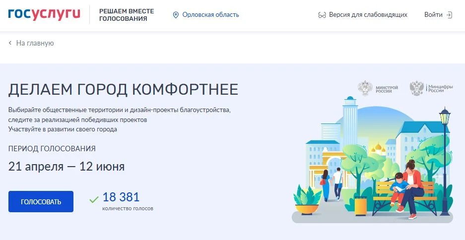 Повлиять на облик родных городов и поселков могут орловчане, достигшие 14-летнего возраста. Чтобы отдать свой голос, достаточно перейти на официальный сайт голосования на Госуслугах и выбрать объект.