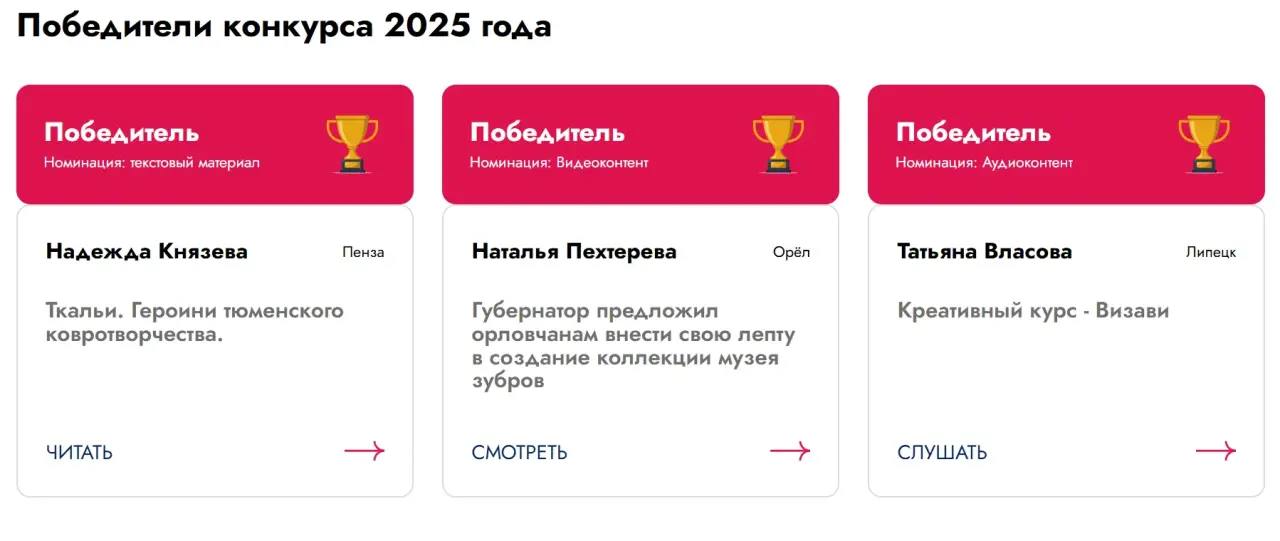 Всего на конкурс было подано 268 заявок из разных регионов России. Помимо нашей работы победителями стали наши коллеги из Пензы (в номинации "Текстовый материал") и из Липецка (номинация "Аудиоконтент").