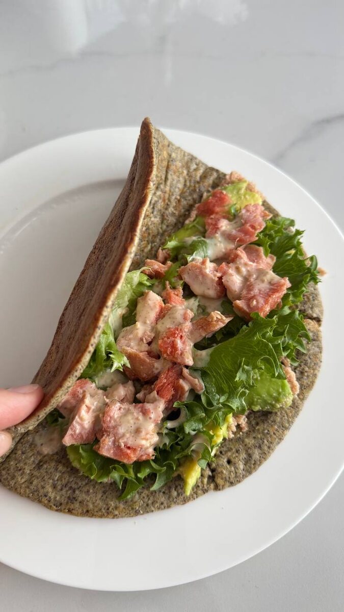 Тунец был запечён в духовке, что придаёт ему особую нежность и аромат. Он станет отличным дополнением к свежему овощному салату, а вот для блинчиков его текстура может оказаться немного суховатой. Чтобы исправить это, смело можно добавить кунжутный соус — он придаст блюду необходимую сочность и изысканный вкус.