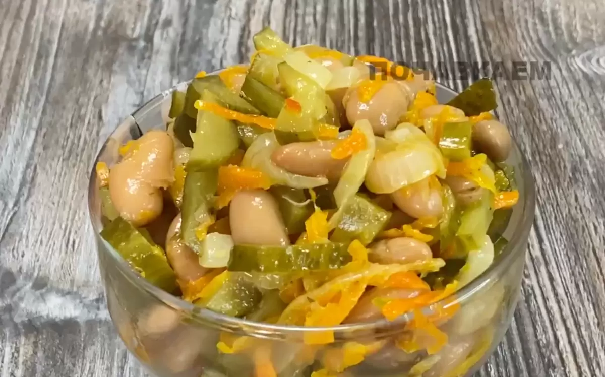 3. Собираем салат: В глубокой миске соедините фасоль, огурцы и теплую овощную зажарку. Добавьте немного чёрного перца и аккуратно перемешайте. При желании добавьте рубленую зелень.