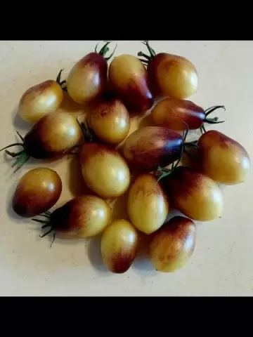 Плоды выглядят эффектно: они овальные, с заострением у основания. По мере созревания фон становится насыщенно-желтым, а плечики окрашиваются в фиолетовый оттенок. Интенсивность пятна зависит от освещённости: на ярком солнце — ярче, в пасмурную погоду — слабее.