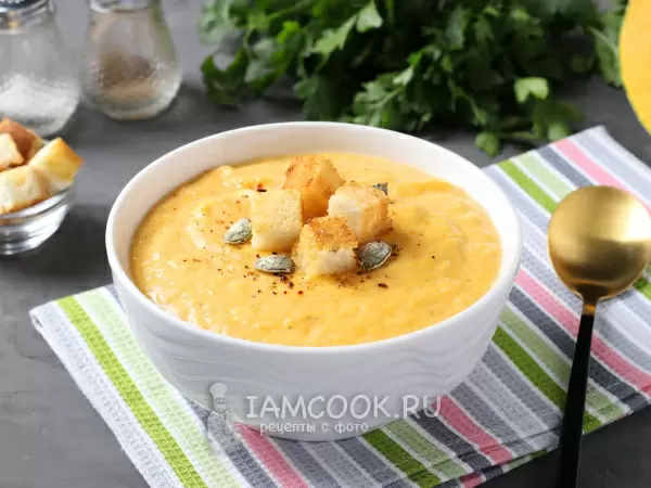 - Тыквенный суп-пюре с курицей и сыром: насыщенный вкус куриного филе в сочетании с бархатистой текстурой тыквы и сливочными нотками сыра создают истинный кулинарный восторг.