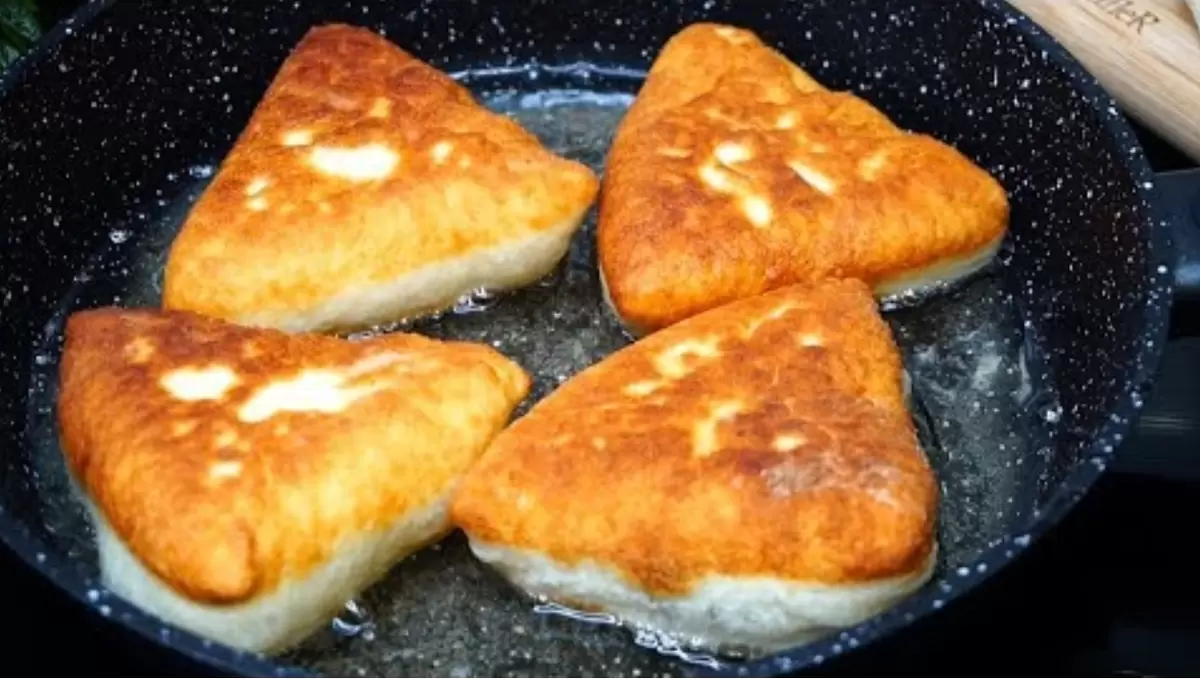 После одного часа ожидания, тесто обминается, делится на небольшие части, и формируются пирожки. Их можно делать в любой форме, однако, лучше всего подходят треугольники для мясной начинки. Жарят пирожки на среднем огне до золотистой корочки с обеих сторон. Главное – не пожалеть масла! Готовые пирожки подаются прямо со сковороды, оставаясь мягкими даже на следующий день.