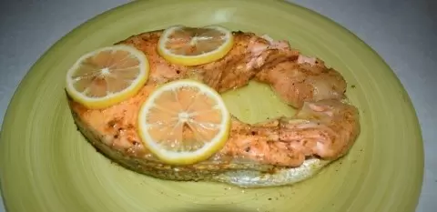 Выложите замаринованный стейк на дно формы, а сверху разместите три кусочка лимона для дополнительного аромата. Закройте крышку и готовьте около 20 - 25 минут. За это время форель пропитается всеми ароматами и станет невероятно нежной.