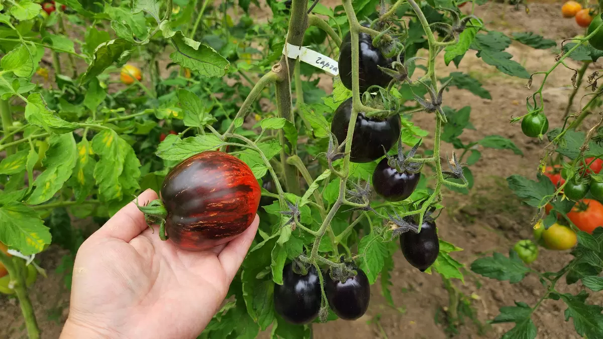 1. Внешний вид: томат «Гаргамель» — настоящий график цветовых изменений. Сначала он зеленовато-фиолетовый, словно спелая слива, а затем превращается в шоколадно-фиолетовый шедевр с оранжевым акцентом. Размер плодов — идеально 100-120 граммов.