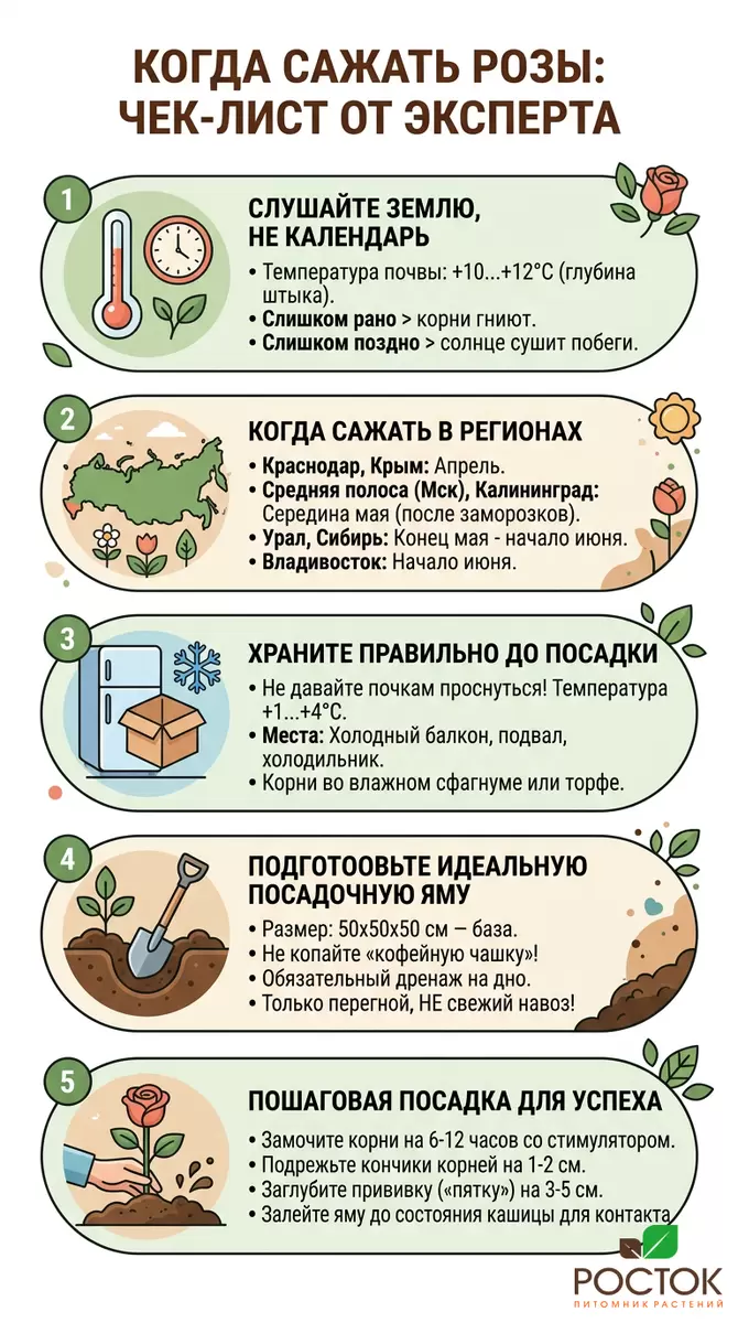 Нельзя указывать одну дату для всей России, так как климатические условия значительно различаются. В питомнике обращают внимание не на календарь, а на температуру почвы. Чтобы розы прижились, грунт должен прогреться до +10...+12°C.