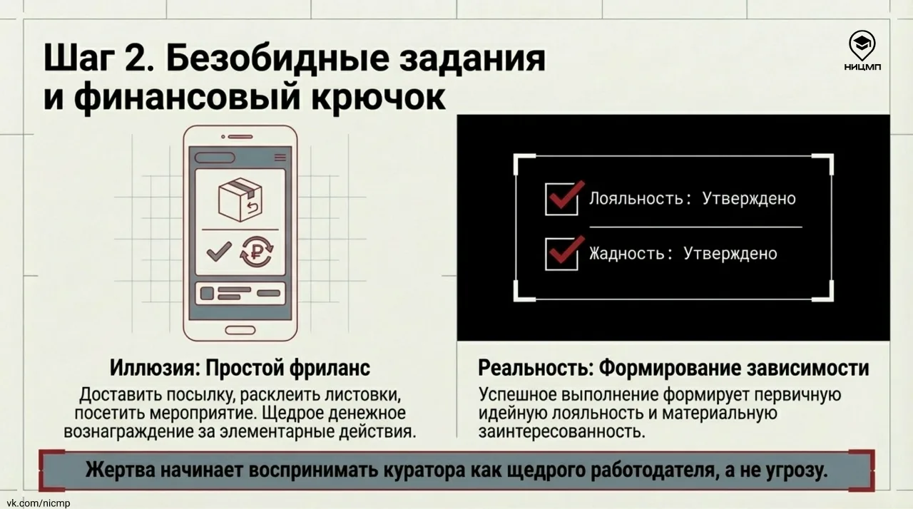 Используются методы психологического воздействия. Вербовщики выстраивают доверительное общение, изучают взгляды и настроение человека, постепенно подводя его к выполнению более серьезных действий.