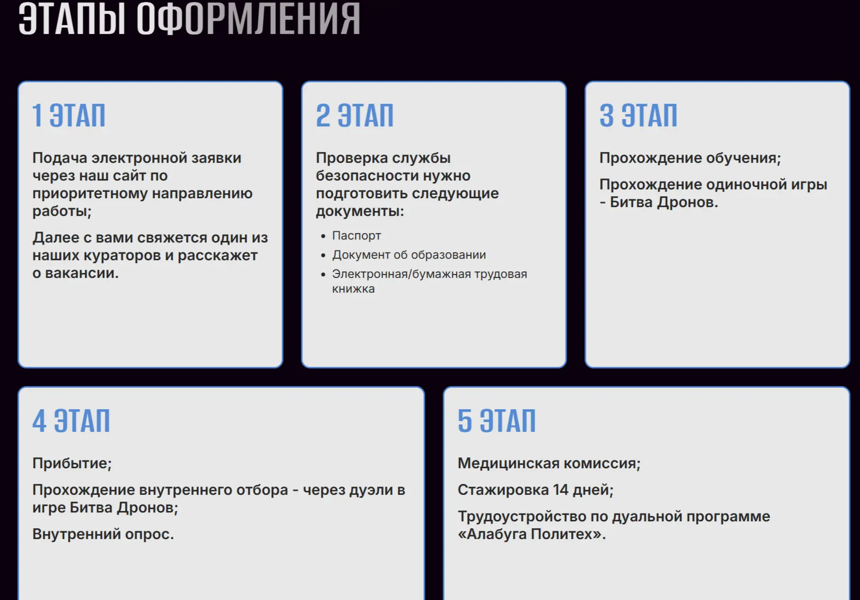 Служба проходит в одном из регионов: Орловская область либо командный центр «Алабуга Политех».