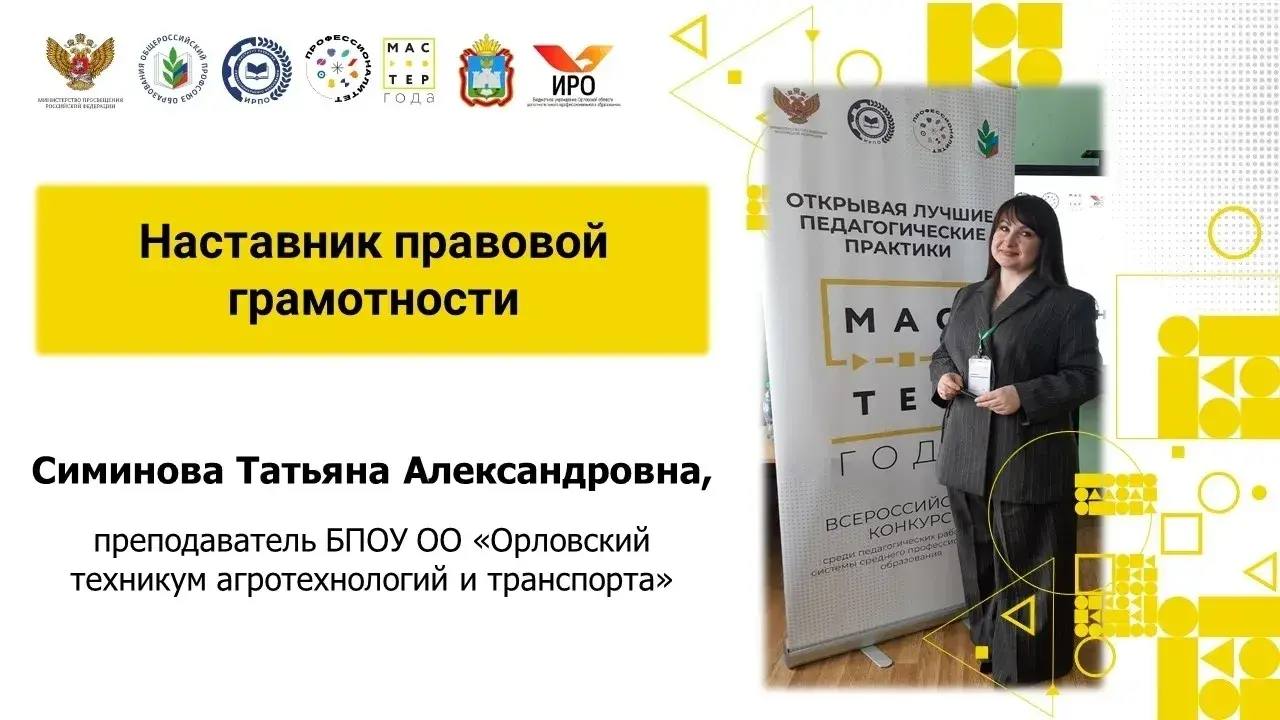А еще отметили наставника правовой грамотности — Татьяну Симинову — преподавателя Орловского техникума агротехнологий и транспорта.