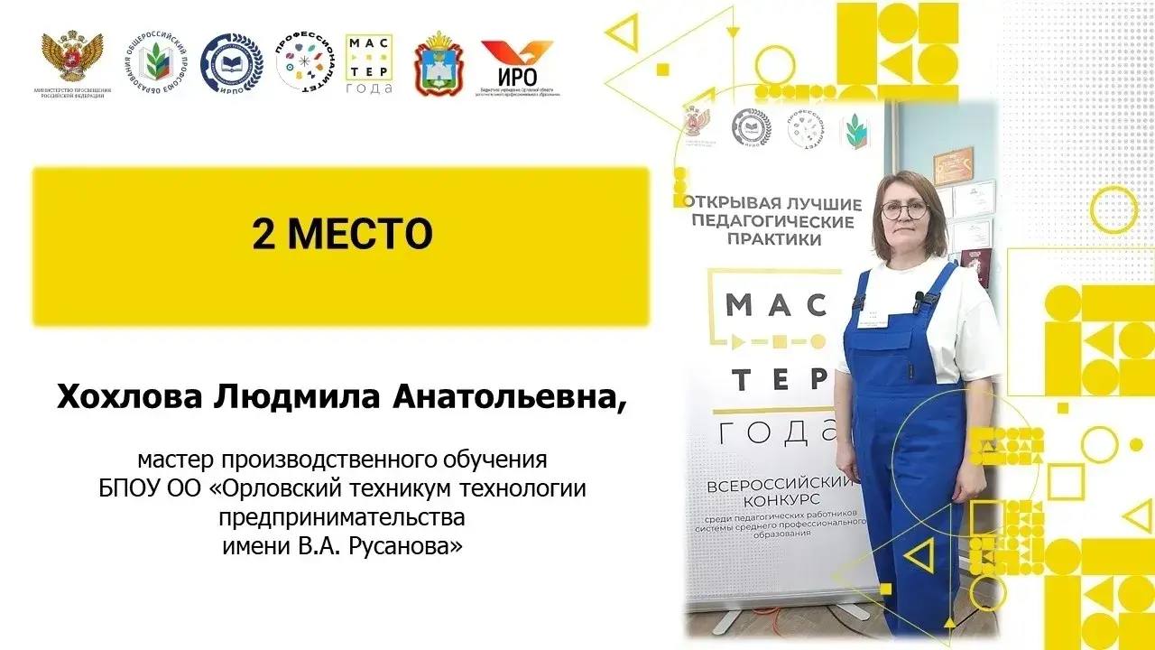 Второе место: Людмила Хохлова — мастер производственного обучения Орловского техникума технологии предпринимательства им. Русанова.