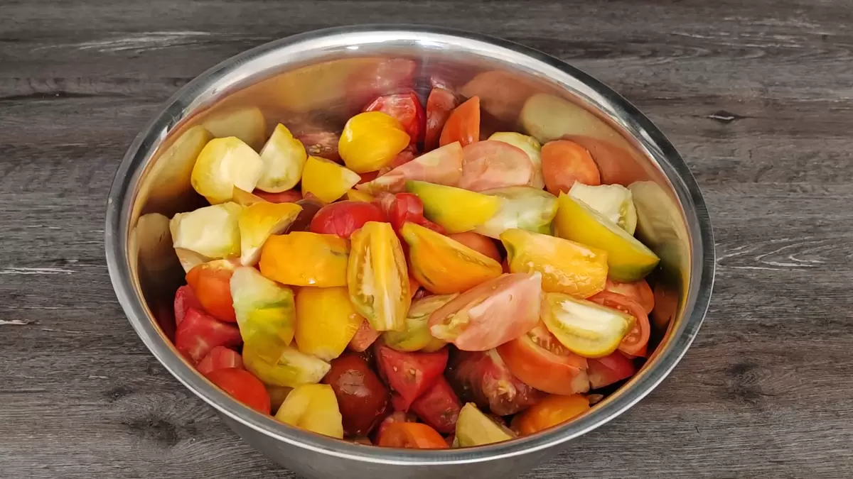 Это невероятно вкусное блюдо точно станет любимым! Начните с того, чтобы тщательно помыть спелые красные и желтые помидоры, удалив поврежденные участки. Пропустите их через мясорубку и доведите до кипения, варя 15 минут.